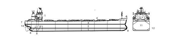 1—船底區(qū);2-水線區(qū);3-干舷區(qū);4-露天甲板;5-上層建筑;6-機(jī)艙;7-淡水艙;8-燃滑油艙;9-艏尖艙;10-艉尖艙;11-貨艙;12-壓載艙